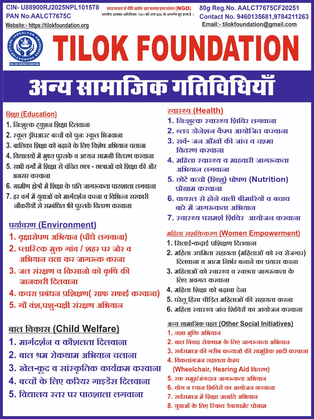 TILOK FOUNDATION एक गैर-लाभकारी संस्था है जो समाज के वंचित, ज़रूरतमंद और उपेक्षित वर्गों के जीवन में सकारात्मक बदलाव लाने के लिए समर्पित है। हमारी संस्था का मुख्य उद्देश्य सभी प्रकार की सोशल एक्टिविटी (शिक्षा, स्वास्थ्य, महिला सशक्तिकरण, पर्यावरण संरक्षण, सामूहिक शादी और गरीबों के लिए सहायता कार्यों के ज़रिए समाज में समरसता और विकास को बढ़ावा देना है।